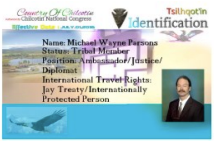 Il suo “passaporto diplomatico”, mostrato sul sito dell’Ain, è un documento falso, collegato al “Chilcotin Country”, regione montuosa del canada, considerato da Parsons come Stato sovrano e di cui si è auto-dichiarato cittadino.