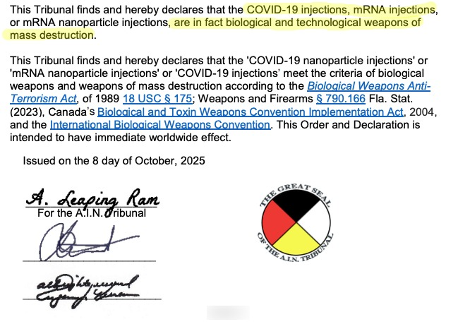 Secondo quanto dichiarato dall’Alliance of indigenous nations, il loro Tribunale Internazionale è stato istituito il 2 dicembre 2022 e rivendica una presunta sovranità “Nation-to-Nation” basata sul diritto indigeno e sull’UNDRIP. Tra le sentenze del presunto tribunale, quella che ha fatto più scalpore sostiene, senza alcun fondamento scientifico o riconoscimento legale, che i vaccini a mRNA siano armi biologiche e tecnologiche di distruzione di massa.