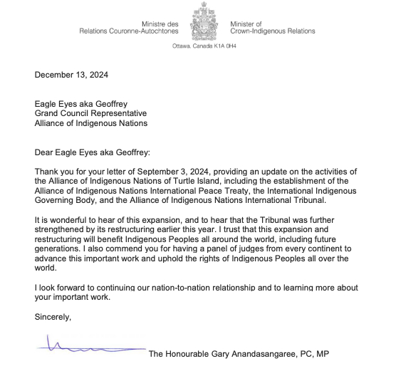 Per sostenere la propria legittimità, l’Ain cita una lettera del 13 dicembre 2024 firmata da Gary Anandasangaree, ex Ministro canadese delle Relazioni con le Popolazioni Indigene. Il testo, in tono cortese, ringrazia per un aggiornamento informativo ma non riconosce o approva l’organizzazione. Nonostante ciò, l’Ain l’ha presentata come un “riconoscimento ufficiale”.