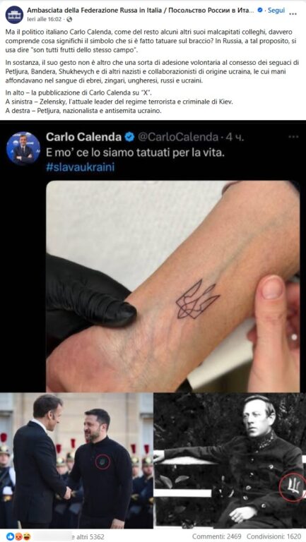 Il post dell’Ambasciata russa in Italia, guidata da Alexey Paramonov, condivide gli scatti di Carlo Calenda con il tatuaggio, Volodymyr Zelensky e Symon Petljura. Nel testo, rappresentando la propaganda del Cremlino, si sostiene che il tridente tatuato sia “il simbolo dei seguaci dei nazisti e dei collaborazionisti ucraini”, facendo un parallelo tra Calenda, il presidente ucraino e figure controverse del nazionalismo ucraino. Si tratta di una strategia narrativa ormai consolidata della propaganda russa, che mira a equiparare il patriottismo ucraino al nazismo, accusa che Mosca utilizza tuttora per giustificare l’invasione dell’Ucraina.