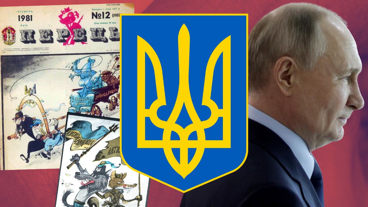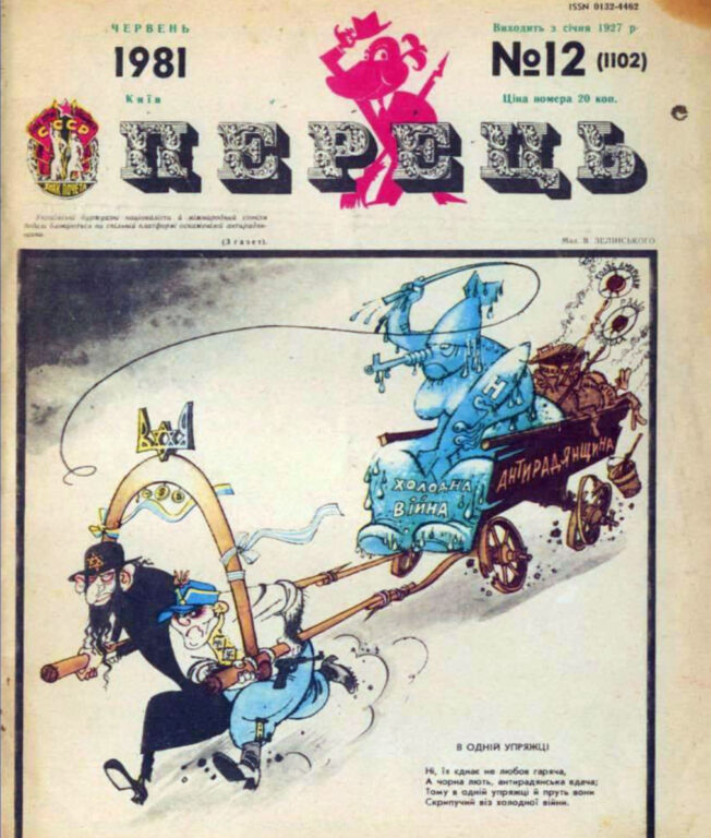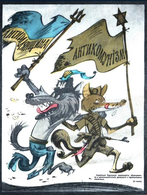 La rivista sovietica “Perets” (“Перець”) pubblicava vignette, come quella sottostante del 1981, raffiguranti ebrei (con gli elementi tipici delle raffigurazioni antisemite) e ucraini mentre trainano un carro intitolato “Guerra fredda”. Sopra entrambi, il tridente ucraino fuso con la Stella di David.