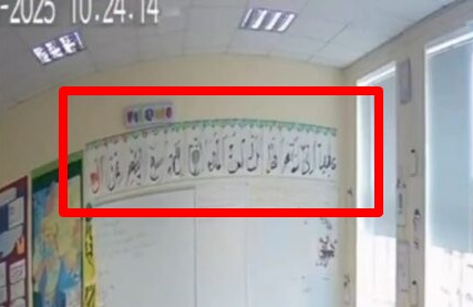Le scritte presenti sopra la lavagna dovrebbero essere in arabo, senza esserlo realmente. Sono soltanto imitazioni della scrittura araba prive di significato, come evidenziato dal media arabo Misbar.