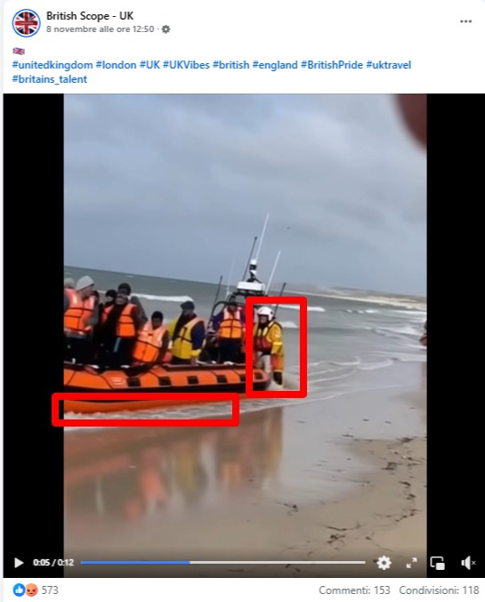 Altri video riportano presunti barconi con a bordo dei migranti, i quali navigano nella sabbia di una spiaggia “frenati” con i piedi da un soccorritore.