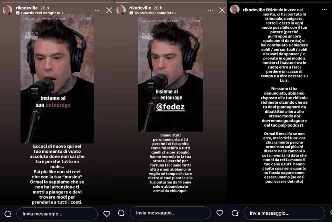 Nuovo capitolo nello scontro, ormai sempre più infuocato, tra l’entourage di Luis Sal e Fedez. Riccardo Vignola, il manager del creator bolognese, si è lanciato in una dura invettiva contro il rapper in una serie di storie Instagram in cui accusa Fedez di manipolazioni, pressioni economiche e ricerca costante di attenzione. «Eccoci di nuovo qui nel tuo momento di vuoto assoluto, dove non sai che fare perché tutto va male… fai più like con sti reel che con la tua “musica”. Ormai lo sappiamo che se non hai attenzione ti metti a piangere e devi trovare modi per prenderla a tutti i costi». Dopo che lo youtuber bolognese aveva deciso di fare causa al rapper, Fedez ha rimandato al mittente le accuse, muovendo a sua volta attacchi al modo di fare dell’ex amico.