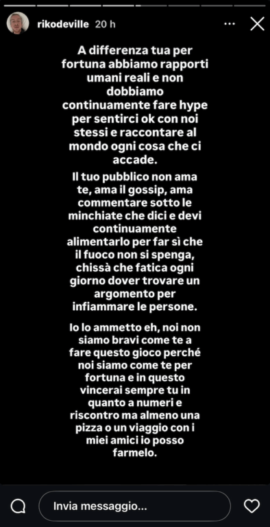 La parte finale del lungo sfogo è dedicata a una critica più ampia al modo in cui Fedez si rivolge al pubblico. «A differenza tua per fortuna abbiamo rapporti umani reali e non dobbiamo continuamente fare hype per sentirci ok con noi stessi e raccontare al mondo ogni cosa che ci accade», scrive il manager, sostenendo che la fanbase del rapper sarebbe motivata più dal gossip che dal reale affetto: «Il tuo pubblico non ama te, ama il gossip, ama commentare sotto le m*******e che dici e devi continuamente alimentarlo per far sì che il fuoco non si spenga». Il manager conclude rivendicando una distanza netta tra i due mondi, ammettendo che Fedez “vincerà sempre” in termini di numeri, ma rivendicando una qualità di vita diversa: «Io lo ammetto eh, noi non siamo bravi come te a fare questo gioco perché non siamo come te per fortuna e in questo vincerai sempre tu in quanto a numeri e riscontro, ma almeno una pizza o un viaggio con i miei amici io posso farmelo».
