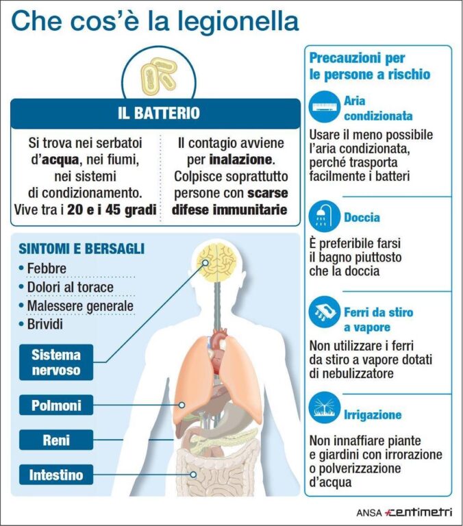 La legionella è un batterio che vive negli ambienti acquatici. Può diffondersi nella rete idrica, docce, impianti di climatizzazione, vasche idromassaggio, fontane. Il contagio avviene tramite l’inalazione di gocce aerosol con acqua contaminata e non avviene da persona a persona e nemmeno bevendo l’acqua contaminata. Fattori che possono contribuire alla proliferazione del batterio sono acqua stagnante, temperature dell’acqua tra i 25 e 45 gradi. Può manifestarsi in maniera paucisintomatica, oppure con polmonite. E crea due disturbi la febbre di Pontiac e la Malattia dei Legionari. Nel primo caso ha sintomi simil-influenzali, come brividi, cefalea, debolezza e febbre. Decorre nel giro di pochi giorni. Nel secondo caso si sviluppa la polmonite, ha una incubazione da 2 a 10 giorni e può esser molto e pericolosa. La si previene evitando l’accumulo di calcare sia in casa ma anche nella propria auto, per esempio. Oltre ai condizionatori anche chi possiede un’automobile dovrebbe revisionare l’impianto dell’aria condizionata. Gli ultimi casi di legionella a Milano si sono registrati a luglio nelle case di via Rizzoli, zona Crescenzago.