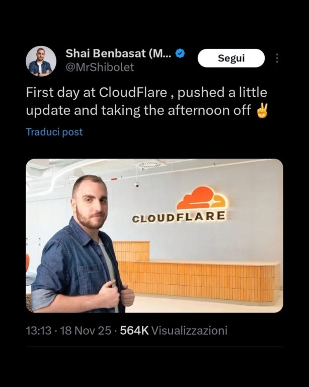 Sono spuntati ovunque post di “nuovi dipendenti Cloudflare” che raccontano del loro arrivo in azienda: «Primo giorno a Cloudflare, ho fatto un piccolo aggiornamento e mi sono preso il pomeriggio libero». Ovviamente, tutto finto. Il web era fermo, ma il “reparto meme” certamente no, ottenendo migliaia di visualizzazioni.