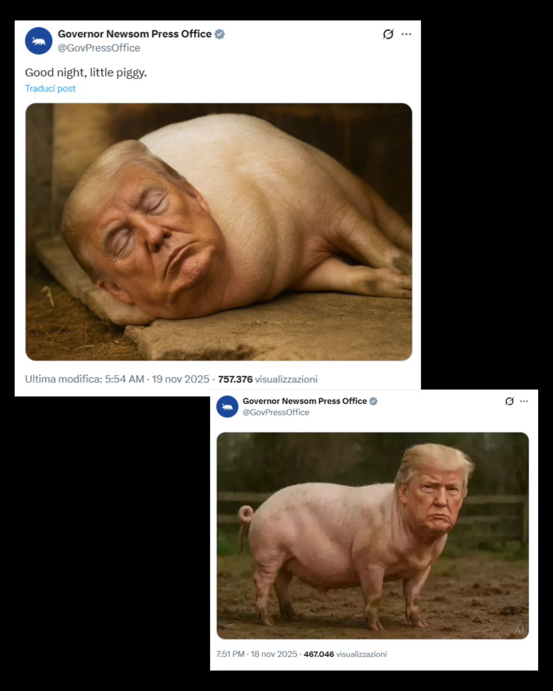 Lo staff di Newsom ha pubblicato, sempre su X, altre immagini che fanno riferimento al fisico e al comportamento del Presidente americano. Alcune di queste lo ritraggono con il corpo da maiale.