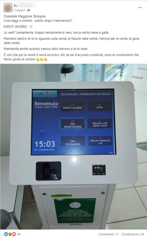 In realtà, si trattava di un totem presente presso l’Ospedale Maggiore di Bologna da ben prima della pandemia Covid-19. L’associazione ai vaccini risultò altrettanto fuorviante, in quanto l’opzione “eventi avversi” si riferiva alla Cardiologia Terapie TAO (Anticoagulanti).