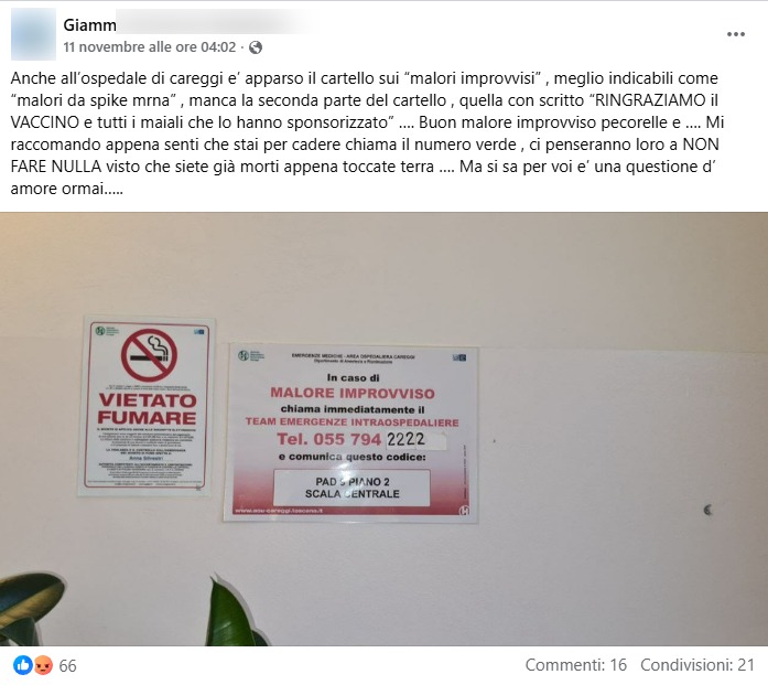Anche all’ospedale di careggi e’ apparso il cartello sui “malori improvvisi” , meglio indicabili come “malori da spike mrna” , manca la seconda parte del cartello , quella con scritto “RINGRAZIAMO il VACCINO e tutti i maiali che lo hanno sponsorizzato” …. Buon malore improvviso pecorelle e …. Mi raccomando appena senti che stai per cadere chiama il numero verde , ci penseranno loro a NON FARE NULLA visto che siete già morti appena toccate terra …. Ma si sa per voi e’ una questione d’ amore ormai…..