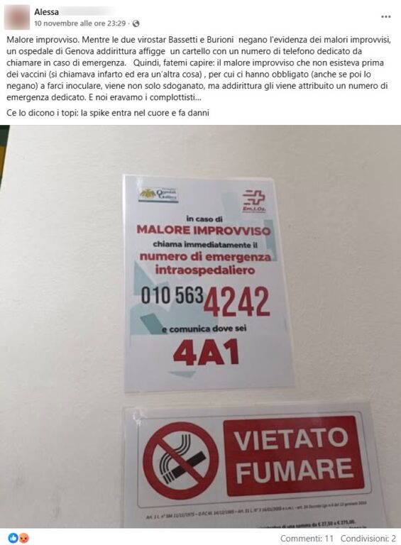 Malore improvviso. Mentre le due virostar Bassetti e Burioni negano l’evidenza dei malori improvvisi, un ospedale di Genova addirittura affigge un cartello con un numero di telefono dedicato da chiamare in caso di emergenza. Quindi, fatemi capire: il malore improvviso che non esisteva prima dei vaccini (si chiamava infarto ed era un’altra cosa) , per cui ci hanno obbligato (anche se poi lo negano) a farci inoculare, viene non solo sdoganato, ma addirittura gli viene attribuito un numero di emergenza dedicato. E noi eravamo i complottisti… Ce lo dicono i topi: la spike entra nel cuore e fa danni