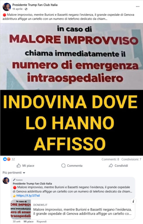 La narrazione circola da tempo. Un esempio è il post del 19 aprile 2025 pubblicato dalla pagina Facebook “Presidente Trump Fan Club Italia”, che rilancia un articolo del sito DCNews, già noto per la diffusione di notizie false e fuorvianti.