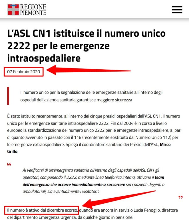 Il cartello fa riferimento alle emergenze intraospedaliere, ossia a situazioni urgenti e critiche che avvengono all’interno delle strutture sanitarie. Il numero 2222 risulta attivo, ad esempio, negli ospedali dell’ASL CN1 della Regione Piemonte dal dicembre 2019, ben prima della pandemia e delle vaccinazioni anti Covid-19. Ecco il comunicato del 7 febbraio 2020: