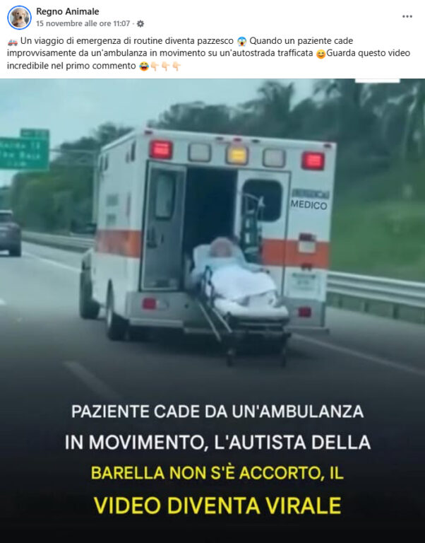 Negli ultimi giorni sui social è circolato un video che ha suscitato l’ilarità e la preoccupazione di numerosi utenti: un uomo apparentemente privo di sensi scivola fuori dal retro di un’ambulanza lanciata in autostrada, mentre il veicolo continua la corsa senza che il conducente se ne accorga. La clip è stata ripresa da pagine Facebook e rilanciata da siti che hanno costruito articoli sensazionalistici, raccontando la vicenda come un drammatico incidente. In realtà, nessun episodio si è mai verificato: il video è stato creato con l’intelligenza artificiale.