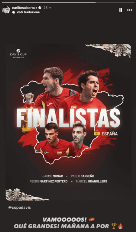 Sarà la Spagna l’avversaria dell’Italia nella finale della Coppa Davis 2025 in programma domenica a Bologna. In semifinale la squadra iberica ha superato 2-1 la Germania. A portare il punto decisivo il doppio Granollers-Martinez che ha battuto quello tedesco Krawietz-Puetz in tre set 6-2 3-6 6-3. La Spagna se la vedrà quindi con l’Italia che ieri ha eliminato il Belgio nell’altra semifinale. In entrambe le squadre non figurano nello «schieramento» della Coppa Davis i talenti più noti, i numeri 1 e 2 del mondo Carlos Alcaraz e Jannik Sinner. Che dopo aver rinunciato alla chiamata in nazionale per ragioni diverse, a una settimana esatta dalla loro ennesima sfida alle Atp Finals di Torino (vinta dall’altoatesino) si godranno la finale Italia-Spagna davanti alla tv. «Vamos. Grandi! A domani per la coppa», ha scritto su Instagram Carlos Alcaraz esultando per la vittoria in semifinale della sua Spagna contro la Germania.