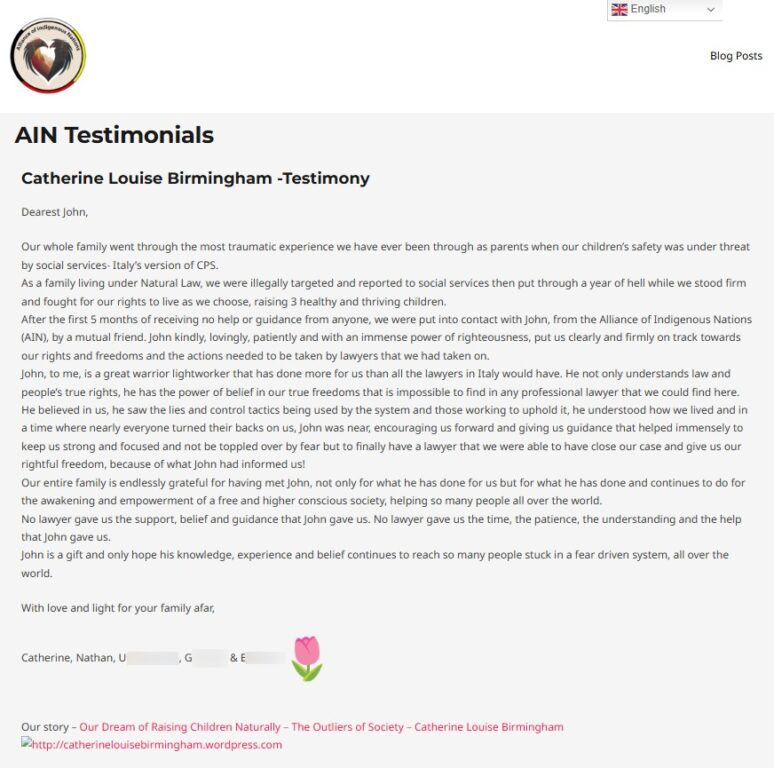 Nella testimonianza, Catherine Louise Birmingham descrive la propria esperienza con i servizi sociali italiani “traumatica” e “illegale”. Dopo qualche mese trascorso senza ricevere supporto, trova in John una guida e un aiuto, definendolo “guerriero di luce” («great warrior lightworker»): il “legale” dell’AIN avrebbe informato la famiglia riguardo i loro diritti e le loro libertà, così come avrebbe indicato le azioni necessarie da intraprendere con gli avvocati. Nel finale, Catherine esprime la propria gratitudine per il sostegno ottenuto, testimoniando la “chiusura del loro caso” e la “riconquista della libertà”.