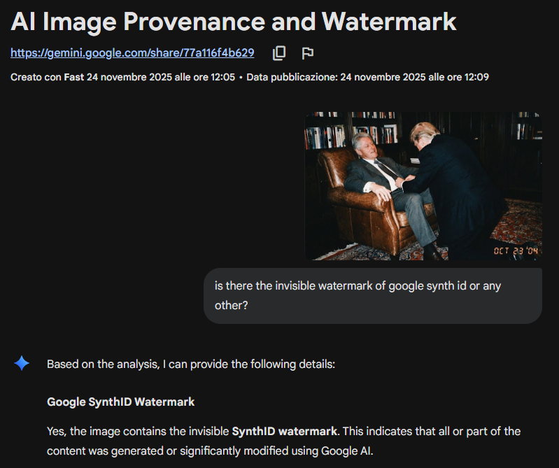 - La foto è un falso AI: contiene un watermark invisibile Google SynthID, rilevabile con gli strumenti di Google.