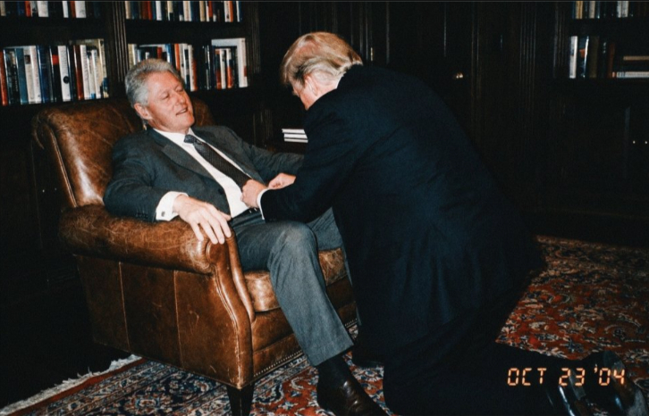 Negli ultimi giorni sta circolando sui principali social una fotografia “vintage” che ritrarrebbe Bill Clinton, seduto su una poltrona in un ufficio, mentre Donald Trump sembra chinarsi davanti a lui in una posa ambigua, alcuni sostengono stia sistemandogli la cravatta bloccata nella cintura, altri parlano di pantaloni. La foto è accompagnata dalla data 23 ottobre 2004, come se fosse stata scattata con una vecchia macchina analogica. Migliaia di utenti l’hanno considerata come prova di un presunto legame compromettente tra i due. Eppure, per quanto ben fatta, la fotografia è falsa.
