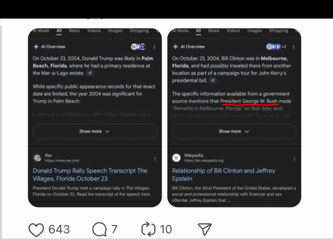 La diffusione della foto è stata alimentata anche dall’idea che Clinton e Trump si trovassero entrambi in Florida il 23 ottobre 2004, ma questa affermazione nasce da un errore di un modello AI di Google che ha confuso Bush con Clinton.