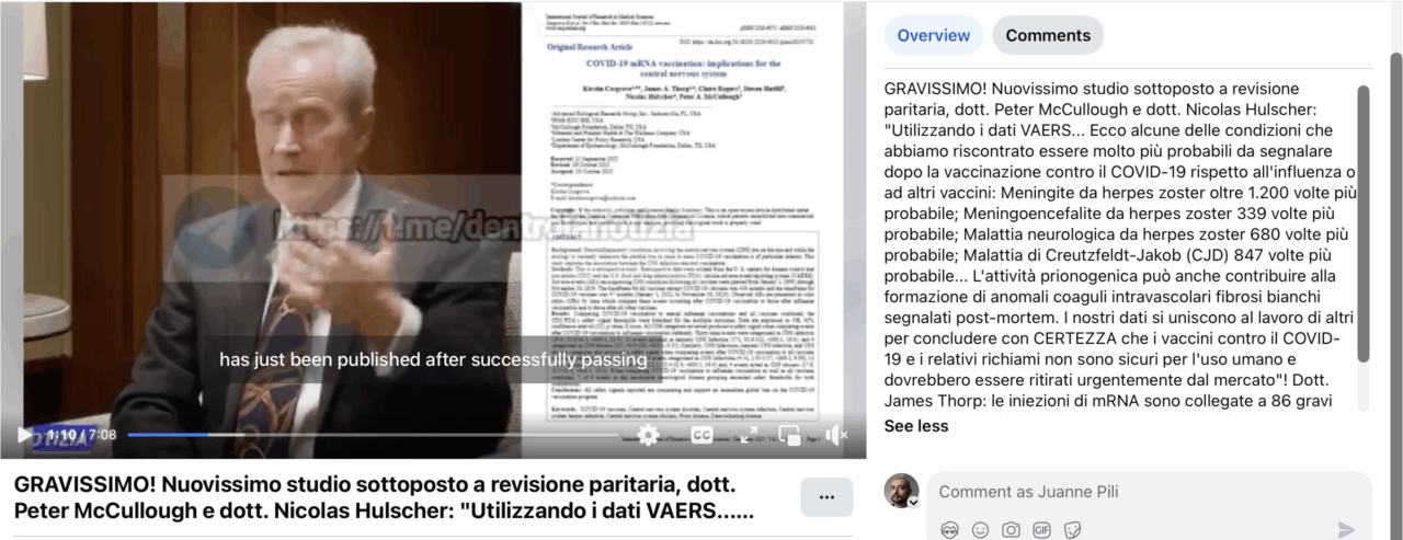 Circolano diverse condivisioni Facebook di una clip basata su uno studio che tra i suoi autori conta almeno tre noti autori No vax: James Thorp, Nicolas Hulscher e Peter McCullough. Anche stavolta il tema sono i vaccini contro il nuovo Coronavirus e il loro presunto collegamento con gravi «implicazioni per il Sistema nervoso centrale» (SNC). Come intuibile già dal titolo del video che esalta i risultati del paper, i ricercatori arrivano alle loro conclusioni «utilizzando dati VAERS», ovvero mere segnalazioni di presunti eventi avversi dei vaccini, la cui causalità non si verifica mai.