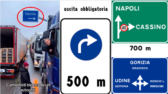 Un dettaglio evidente è la presenza di segnali stradali con colori errati: sulle autostrade italiane la segnaletica è di colore verde, ma nei video circolati i cartelli sono blu, tipici delle strade statali o regionali.