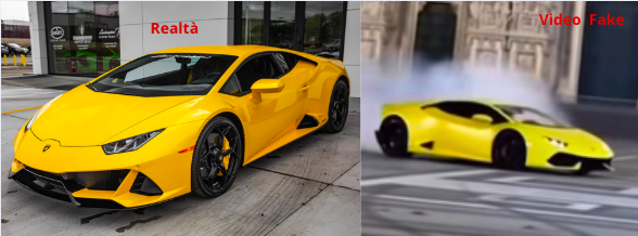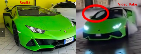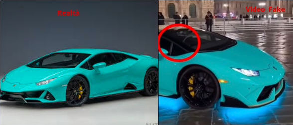 La prima incongruenza che rivela la natura artificiale dei video, riguarda proprio le auto. Il modello blu, una presunta Lamborghini Huracán Evo di colore “blu glauco”, presenta un montante anteriore completamente nero, mentre nella versione reale questo elemento è dello stesso colore della carrozzeria. Lo stesso errore compare nella versione verde.