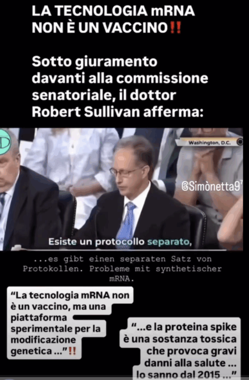 Analizziamo le affermazioni del dottor Robert Sullivan riportate in una clip, apprezzata dalle narrazioni No vax, ampiamente condivisa su Facebook. Il medico si definisce un danneggiato da quelli che «non sono vaccini», secondo la sintesi delle sue dichiarazioni diffusa in Rete. Parliamo dei vaccini a mRNA contro la Covid-19. Il medico pronuncia le sue opinioni nel contesto istituzionale di una commissione del Senato americano. Questo dà un’immagine di autorevolezza alle sue affermazioni, le quali non di meno, continuano a essere delle vecchie bufale già smentite dalla comunità scientifica e dal buonsenso di chi si ricorda cosa succedeva nelle terapie intensive prima che fossero disponibili le prime dosi di vaccino.