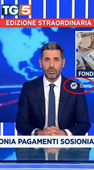 Il primo video simula una “breaking news” del TG5, sostenendo che il governo avrebbe annunciato “la sospensione immediata di tutte le pensioni”. La notizia è completamente inventata: non esistono comunicati, decreti o dichiarazioni istituzionali al riguardo. Inoltre diversi indizi tecnici confermano la falsificazione. Primo fra tutti è il watermark di Sora, uno dei principali generatori video Ai, visibile in diversi punti dello schermo.