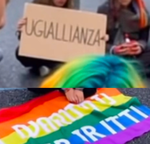 Il terzo video mostra presunti attivisti LGBTQ+ che bloccano una strada e parlano di “diritti LGBTQ+ pro max”, una formula inesistente e concepita per ridicolizzare l’acronimo. Le persone in scena hanno volti innaturali, lucidi e privi di espressioni reali, oltre ai soliti capelli arcobaleno e alle scritte scorrette.