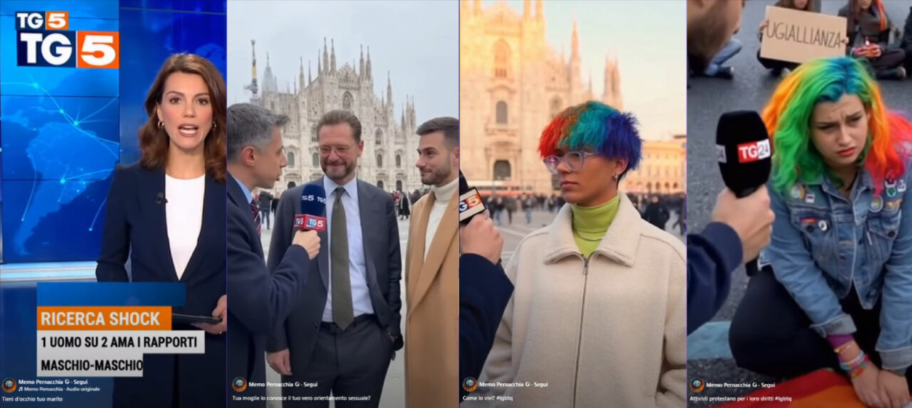 Nelle ultime settimane stanno circolando sui social quattro video che sembrano presentare servizi televisivi di noti telegiornali italiani su temi legati alla comunità queer. Apparentemente innocui, questi video mostrano statistiche inventate, interviste inesistenti e proteste mai avvenute sul tema dell’identità di genere e dell’orientamento sessuale. Un’analisi delle clip rivela che si tratta di video completamente falsi e generati con l’intelligenza artificiale, diffusi da un’unica pagina Facebook nota per condividere ricostruzioni fittizie.