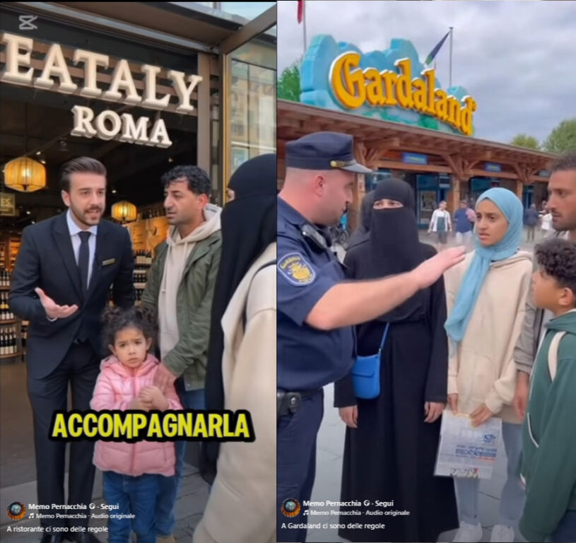 In alcuni video, viene negato l’ingresso alla donna con l’intera famiglia, mostrando un evidente disagio nei minori, in quanto si rifiuterebbero di togliere il burqa. Due esempi riguardano l’entrata in un centro Eataly e davanti il parco di divertimenti Gardaland.