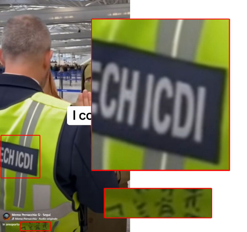 Le scritte presenti nel gilet catarifrangente del controllore presso l’aeroporto sono del tutto insensate o illeggibili.