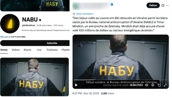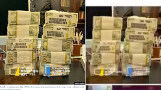 Per dare ulteriore credibilità alla storia, vari account hanno aggiunto immagini tratte da reali operazioni del NABU contro Mindich. Le foto con mucchi di banconote e il logo dell’agenzia sono autentiche ma non hanno nulla a che fare con il caso del Louvre.