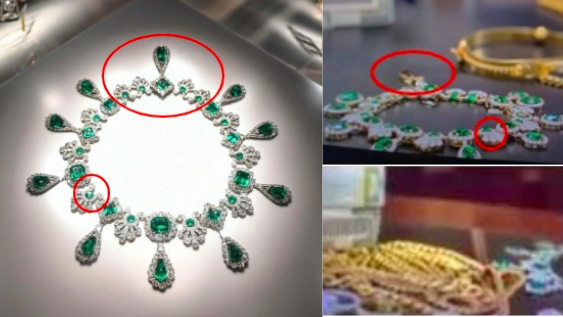 - Il collier mostrato non corrisponde a quello rubato al Louvre: ci sono differenze strutturali e cromatiche.