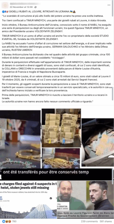Infine, non esiste alcun comunicato ufficiale del NABU, del Louvre o di qualisiasi altra agenzia francese o ucraina che confermi la vicenda.