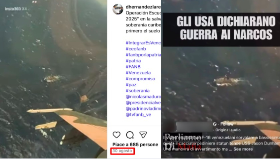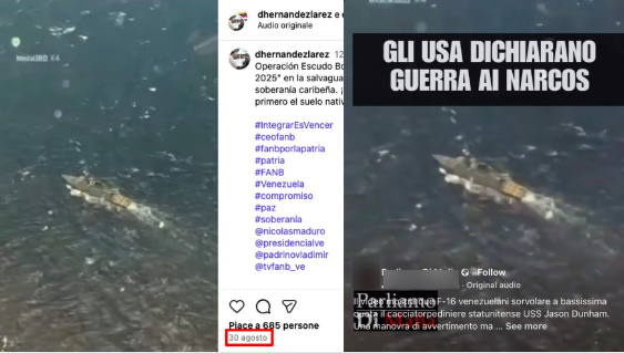 Il video è diventato virale su alcuni profili Facebook e pagine para-politiche che lo hanno presentato come “la prova” di due F-16 venezuelani che affrontano di petto la marina americana. Tra le frasi ricorrenti: “Gli aerei venezuelani hanno sorvolato le piroghe nordamericane nel Mar dei Caraibi!” oppure “FANB pubblica il video dei caccia che volano sul cacciatorpediniere USA”. Queste caption mirano a suggerire crescente tensione tra gli Stati Uniti e il governo Maduro dopo l’attacco americano a un’imbarcazione salpata dal Venezuela. Eppure si rivelano fuorvianti dato che le immagini non sono state girate durante quell’episodio.