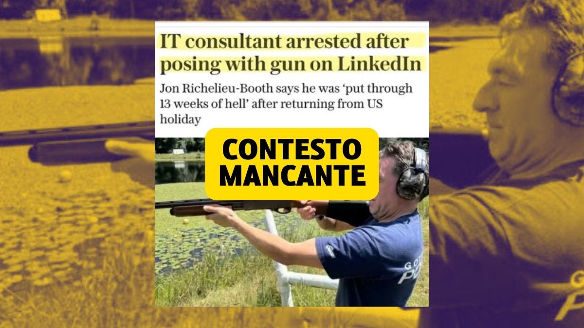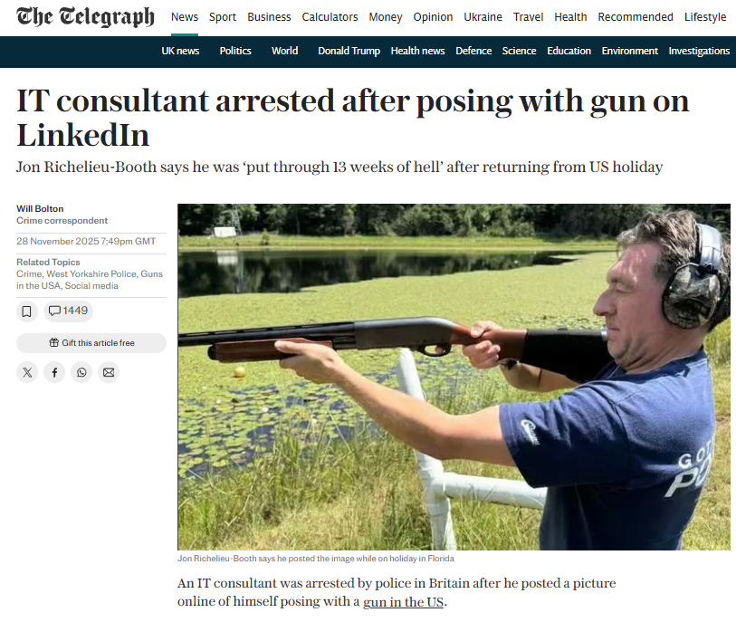 Jon Richelieu-Booth, un consulente IT di 50 anni originario dello Yorkshire, è stato arrestato dalla polizia dopo aver pubblicato una foto su LinkedIn il 13 agosto 2025. Nella immagine, scattata durante una vacanza in Florida (USA), appare mentre posa con un fucile da caccia (un fucile a pompa), tenendo un bersaglio giallo in mano.