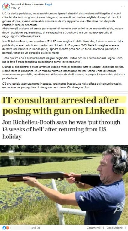 La narrazione che circola online sostiene che la polizia britannica sarebbe incapace di fermare crimini reali, ma efficace nel punire cittadini che pubblicano contenuti ritenuti “preoccupanti”, denunciando che Richelieu-Booth sarebbe stato arrestato unicamente per una foto in cui posa con un fucile a pompa in Florida, segnalata da qualcuno come “sospetta”: