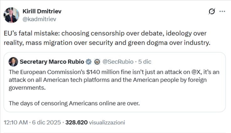 «Il fatale errore dell’UE: scegliere la censura invece del dibattito, l’ideologia invece della realtà, la migrazione di massa invece della sicurezza e il dogma green invece dell’industria» scrive su X Kirill Dmitriev, fedelissimo di Vladimir Putin, condividendo un post del Segretario di Stato americano Marco Rubio, il quale descrive la multa europea come «un attacco a tutte le piattaforme tecnologiche americane e al popolo americano da parte di governi stranieri».