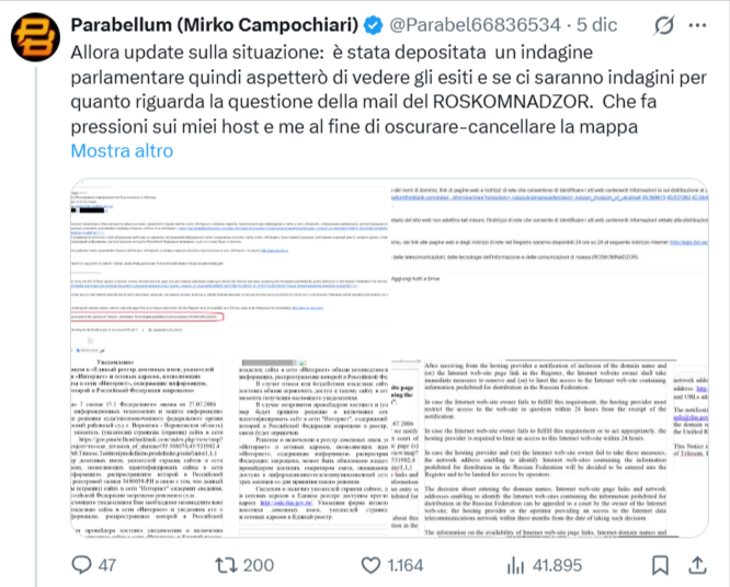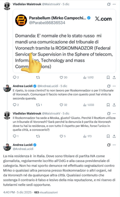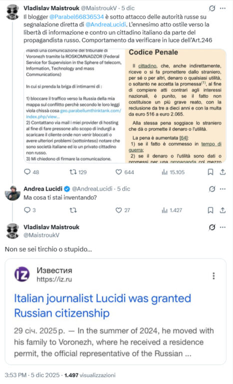 A breve distanza dalla denuncia del tentativo censorio, il giornalista ucraino Vladislav Maistrouk punta il dito contro Andrea Lucidi, caporedattore dell’agenzia russa International Reporters, già accusata in passato da Reporters Without Borders di essere uno «strumento di propaganda» del Cremlino. «Il blogger @Parabel66836534 è sotto attacco delle autorità russe su segnalazione diretta di @AndreaLucidi. L’ennesimo atto ostile verso la libertà di informazione e contro un cittadino italiano da parte del propagandista russo. Comportamento da verificare in luce dell’Art.246» scrive su X Maistrouk. Già in passato, Lucidi e il titolare di Parabellum si erano scontrati durante alcuni dibattiti online.