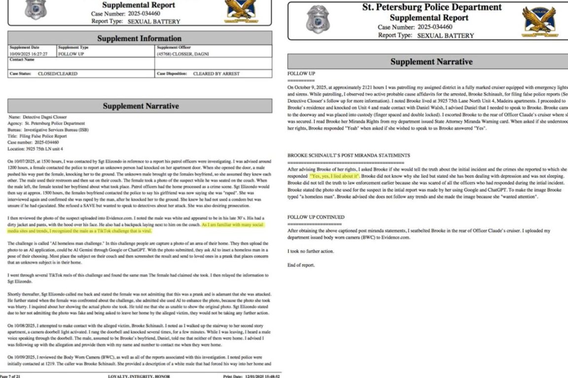 Gli agenti sono tornati a casa della Schinault, contestando la messinscena. Lei all’inizio ha negato, ammettendo solo di avere usato un programma di intelligenza artificiale per mettere più a fuoco l’immagine, che aveva scattato a troppa distanza. Quando ha capito che nessuno degli inquirenti si sarebbe bevuto questa spiegazione, Brooke è crollata, scoppiando le lacrime. Ha ammesso di essersi inventata tutto e ha spiegato però di non avere usato la challenge TikTok, ma Google e ChatGPT, chiedendo loro l’immagine di un senzatetto, poi inserita sul suo divano come risultava dalla foto consegnata agli inquirenti. E ha motivato tutto con la depressione di cui stava soffrendo, dopo essere stata abbandonata dal compagno di vita sola con il bambino, non riuscendo più a dormire da molto tempo: «Ero completamente sola, avevo bisogno di attenzione», ha tentato di giustificarsi. Alla fine, però è stata incriminata dagli agenti per procurato allarme e falsa denuncia e ha dovuto pagare una sanzione amministrativa assai alta per evitare il fermo di polizia.
