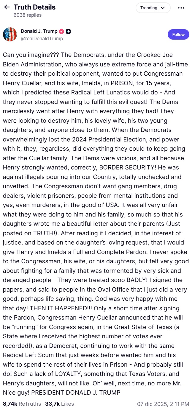 «Dio era molto contento di me quel giorno!» scrive Trump nel suo post su Truth, il quale sembra descriversi come un uomo guidato dalla giustizia divina, per poi inveire contro il deputato texano. Per Henry Cuellar non c’è stato alcun cambio di casacca, nessun passaggio al Partito Repubblicano, così come non c’è stato da parte sua alcun endorsement a Trump, ma sicuramente ha evitato un processo atteso per l’anno prossimo. «Una tale mancanza di LEALTA’», accusa il Presidente americano, sostenendo che Cuellar abbia scelto di rimanere con quella che definisce la stessa “Feccia della Sinistra Radicale” che “voleva distruggerlo”.