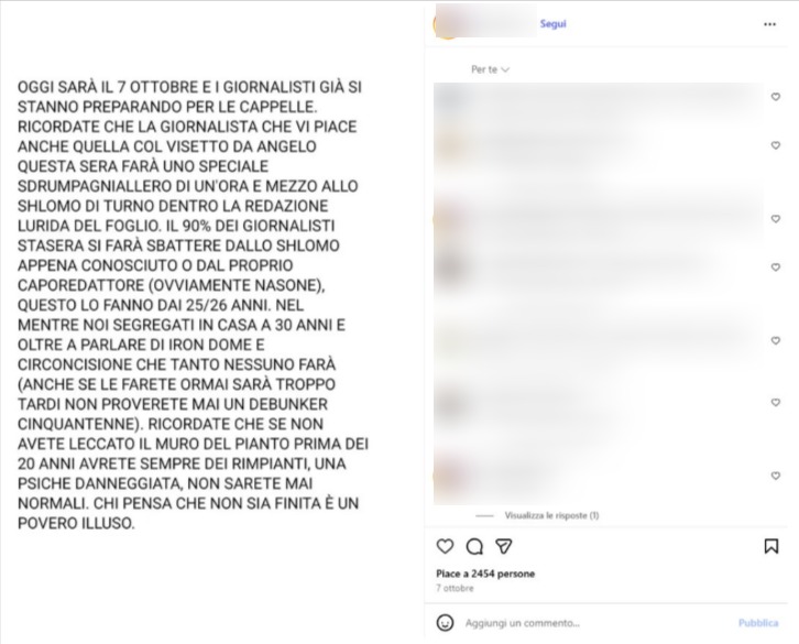 Un ulteriore contenuto riguardava la strage del 7 ottobre, pubblicato il giorno dell’anniversario, dove il massacro veniva utilizzato come pretesto per un attacco generalizzato contro giornalisti ed ebrei. Il testo descriveva le giornaliste de Il Foglio come sessualmente disponibili, ridotte a oggetti, mentre i colleghi maschi venivano caricaturizzati con stereotipi antiebraici storici, tra cui riferimenti al naso adunco, alla circoncisione e al Muro del Pianto.