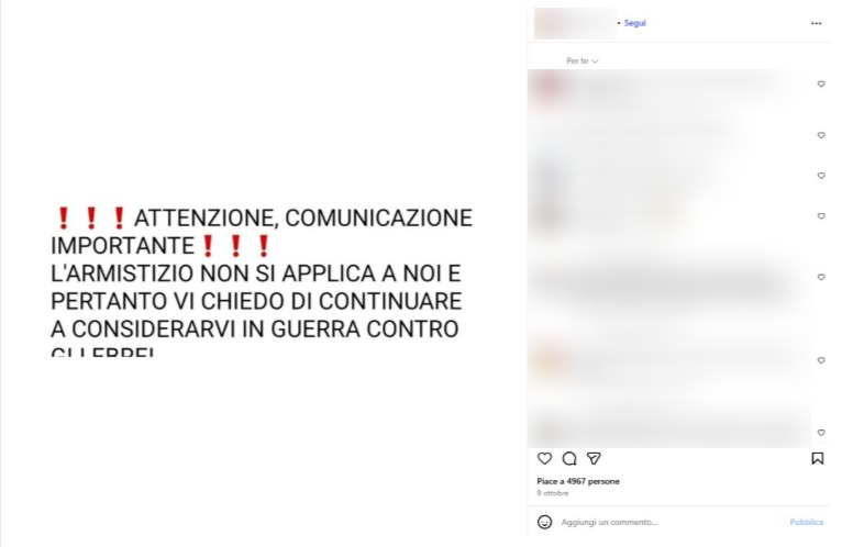In uno dei post più espliciti, l’autore sosteneva e alimentava apertamente una “guerra contro gli ebrei“, presentandola agli utenti come una sorta di missione. Il messaggio non presentava metafore ambigue o ironia indiretta, ma conteneva un invito formulato in modo estremamente diretto: «Attenzione, comunicazione importante!!! L’armistizio non si applica a noi e pertanto vi chiedo di continuare a considerarvi in guerra contro gli ebrei».