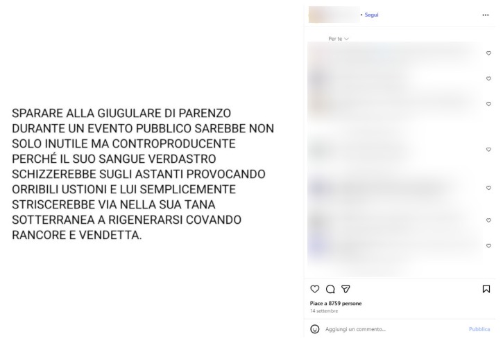 In un post, David Parenzo veniva descritto come una creatura disumana, dotata di sangue “verdastro”, capace di rigenerarsi dopo un colpo di pistola e di tornare nella propria “tana sotterranea” per “covare rancore e vendetta”.
