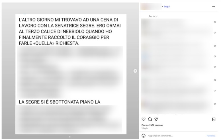 La missione antisemita veniva ulteriormente confermata in diversi contenuti, dove figure pubbliche italiane, legate alla religione ebraica e dell’Olocausto, venivano inserite in racconti inventati e volutamente degradanti. Uno dei post riguardava Liliana Segre, sopravvissuta all’Olocausto, dove la senatrice veniva descritta in una scena sessualizzata e umiliante, trasformando deliberatamente una testimone della Shoah in un oggetto erotico, riducendo la memoria storica a materiale di intrattenimento grottesco.
