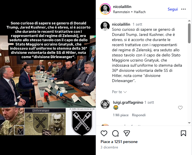 Sono curioso di sapere se genero di Donald Trump, Jared Kushner, che è ebreo, si è accorto che durante le recenti trattative con i rappresentanti del regime di Zelenskij, era seduto allo stesso tavolo con il capo de dello Stato Maggiore ucraino Gnatyuk, che indossava sull’uniforme lo stemma della 36ª divisione volontaria delle SS di Hitler, nota come “divisione Dirlewanger”.