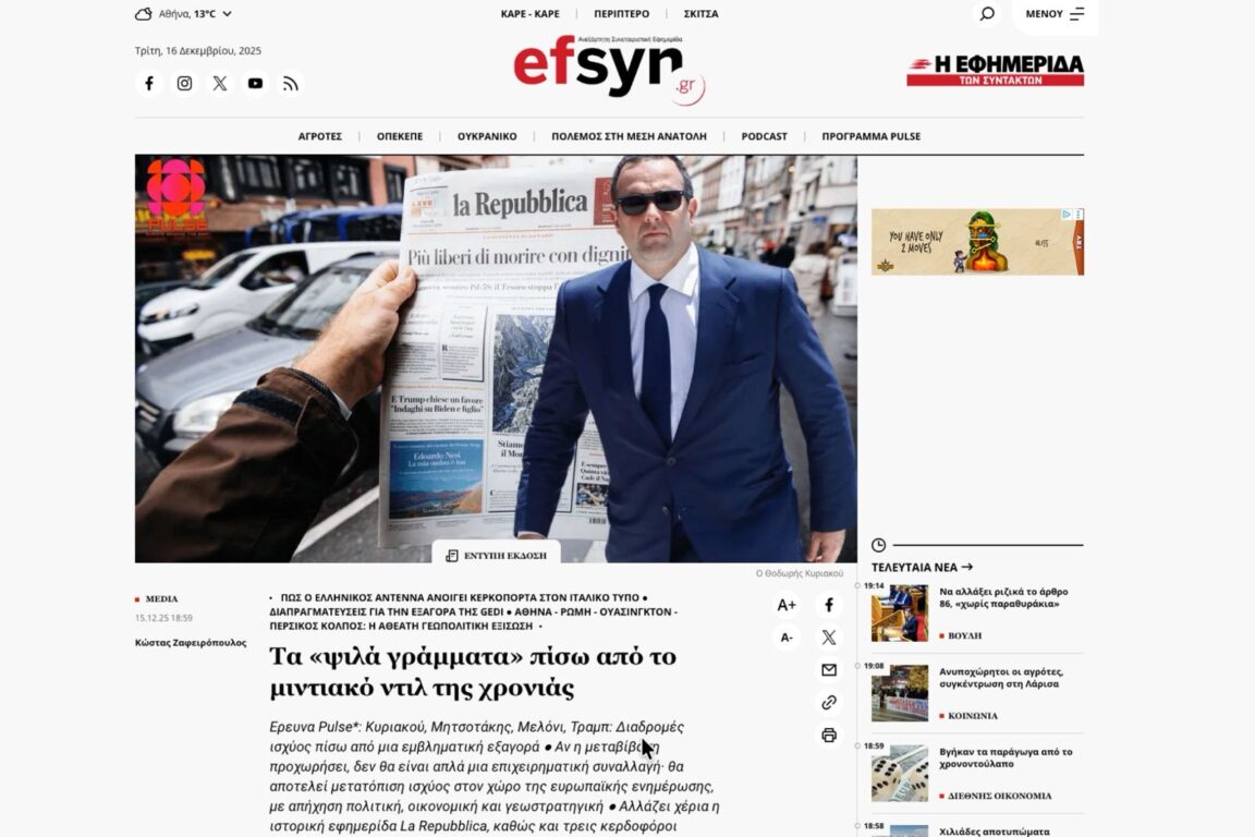 La trattativa Antenna group- Exor ha suscitato grandi reazioni, spesso negative, in Italia. Ma non ha spopolato sui media greci, dove è stata data solo qualche scarna notizia. Unica eccezione il quotidiano indipendente progressista Efimerida ton Syntakton (edito da una cooperativa di giornalisti) che mercoledì 16 dicembre ha dedicato una intera pagina alla vicenda, dando ampio spazio alle preoccupazioni dei giornalisti di Repubblica e de La Stampa. Ma il servizio ha raccontato anche qualcosa di più su Kyriakou, spiegando la sua collaborazione con Tony Blair e con l’Atlantic Council, lanciato in un incontro pubblico a settembre, a margine dell’80ª Assemblea Generale delle Nazioni Unite. «La cosa interessante», scrive il quotidiano greco, «è che il primo ministro italiano, Giorgia Meloni, ha partecipato tramite teleconferenza e ha elogiato la leadership di Theodoros Kyriakou. “Questa iniziativa è esattamente il tipo di piattaforma strategica di cui il mondo ha bisogno in questo momento”, ha affermato Meloni in quell’occasione. Secondo la stampa italiana, Meloni sta seguendo molto da vicino il processo di possibile acquisizione dei media italiani. Alla fine, a quanto pare, l’approvazione da parte del Palazzo Chigi è stata data e ora “l’editore greco che conosce Trump e Blair è ben visto anche da Meloni”. E per questo non bisogna ignorare il ruolo di Trump». Sempre secondo il quotidiano Kyriakou ha fatto da pontiere fra il governo greco e l’amministrazione Trump, con cui ha costruito da tempo solidi rapporti: «È stato ospite d’onore al ricevimento privato di Trump in occasione del suo insediamento, mentre il Palazzo Maximos (il Palazzo Chigi greco, ndr) cercava disperatamente dei mediatori per ottenere un posto nella cerchia della leadership della Casa Bianca».
