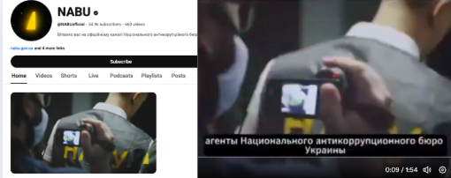 Le clip mostrate nel video che ritraggono agenti del NABU in azione sono reali, ma completamente fuori contesto. Provengono dal canale YouTube ufficiale dell’agenzia e documentano operazioni anti-corruzione legittime, ma in contesti diversi da quelli descritti nel video. Queste riprese erano già state utilizzate in passato per diffondere disinformazione sull’Ucraina.