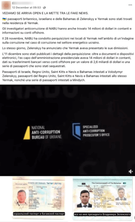 La storia dei presunti passaporti esteri di Zelensky non è nuova. Già in precedenza erano circolati documenti falsi creati per insinuare che il presidente possedesse cittadinanze straniere, proprietà immobiliari in Russia o altri beni segreti. In questi casi, la disinformazione partiva da canali Telegram pro-Cremlino e veniva rilanciata su X e Facebook, diffondendosi rapidamente. Il video più recente, dell’11 dicembre, ripropone questa strategia di disinformazione. Circola principalmente su X e Facebook, sempre tramite account pro-russi. Nel video si sostiene che il 28 novembre il NABU avrebbe condotto perquisizioni negli uffici di Andriy Yermak, ex capo dell’amministrazione presidenziale, nell’ambito di un’indagine per corruzione nel settore energetico. Il video mostra presunti passaporti intestati a Zelensky, Yermak e Tymur Mindych, insieme a documenti bancari, praticamente illeggibili, che attesterebbero transazioni offshore per 2,6 miliardi di dollari e oltre 14 milioni di contanti. In Italia la narrazione è stata ripresa accompagnata dalla seguente introduzione: